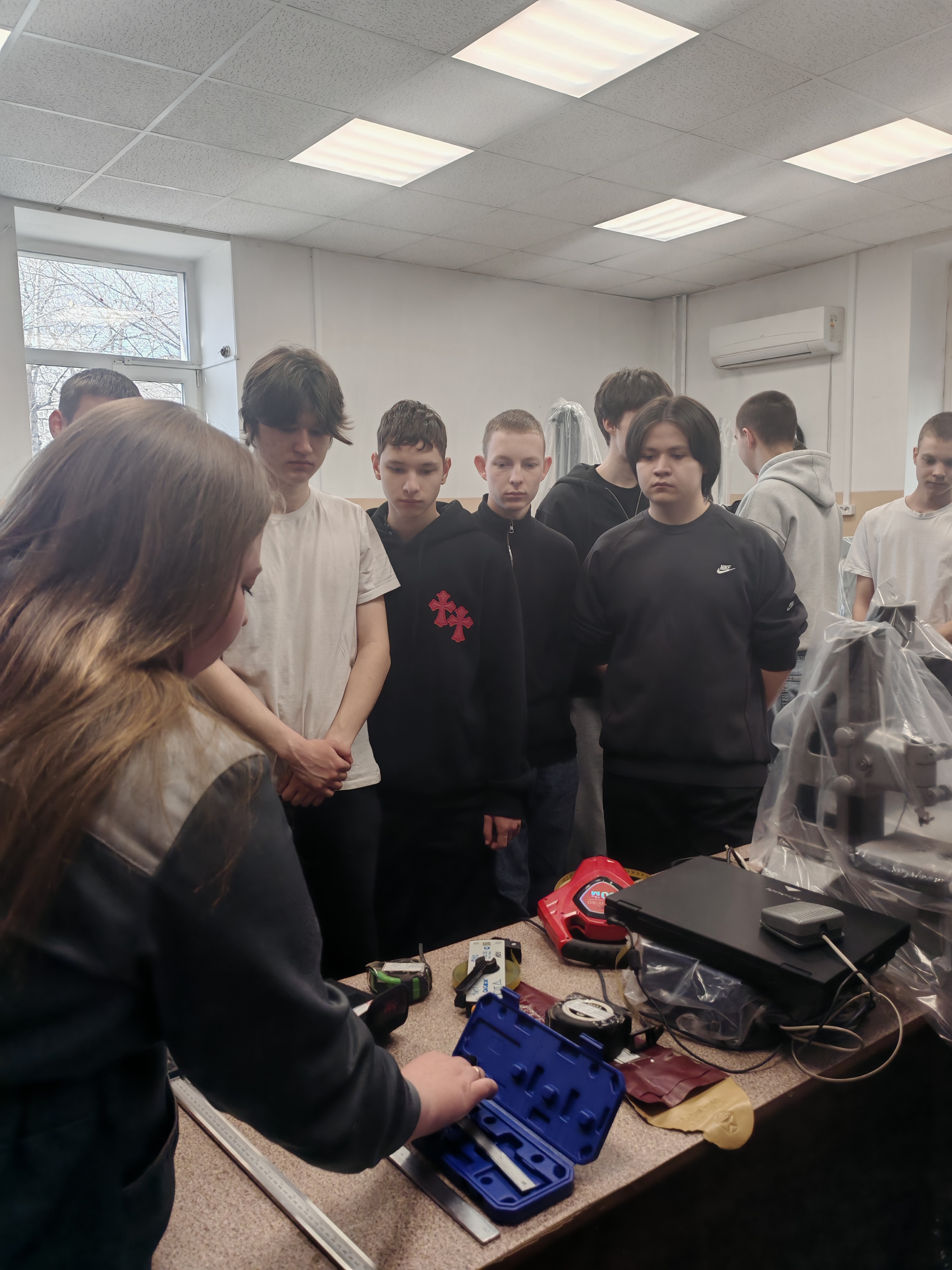 Студенты провели практические замеры с использованием рулеток, штангенциркуля и дальномера, узнали о принципе работы и особенности применения курвиметра.